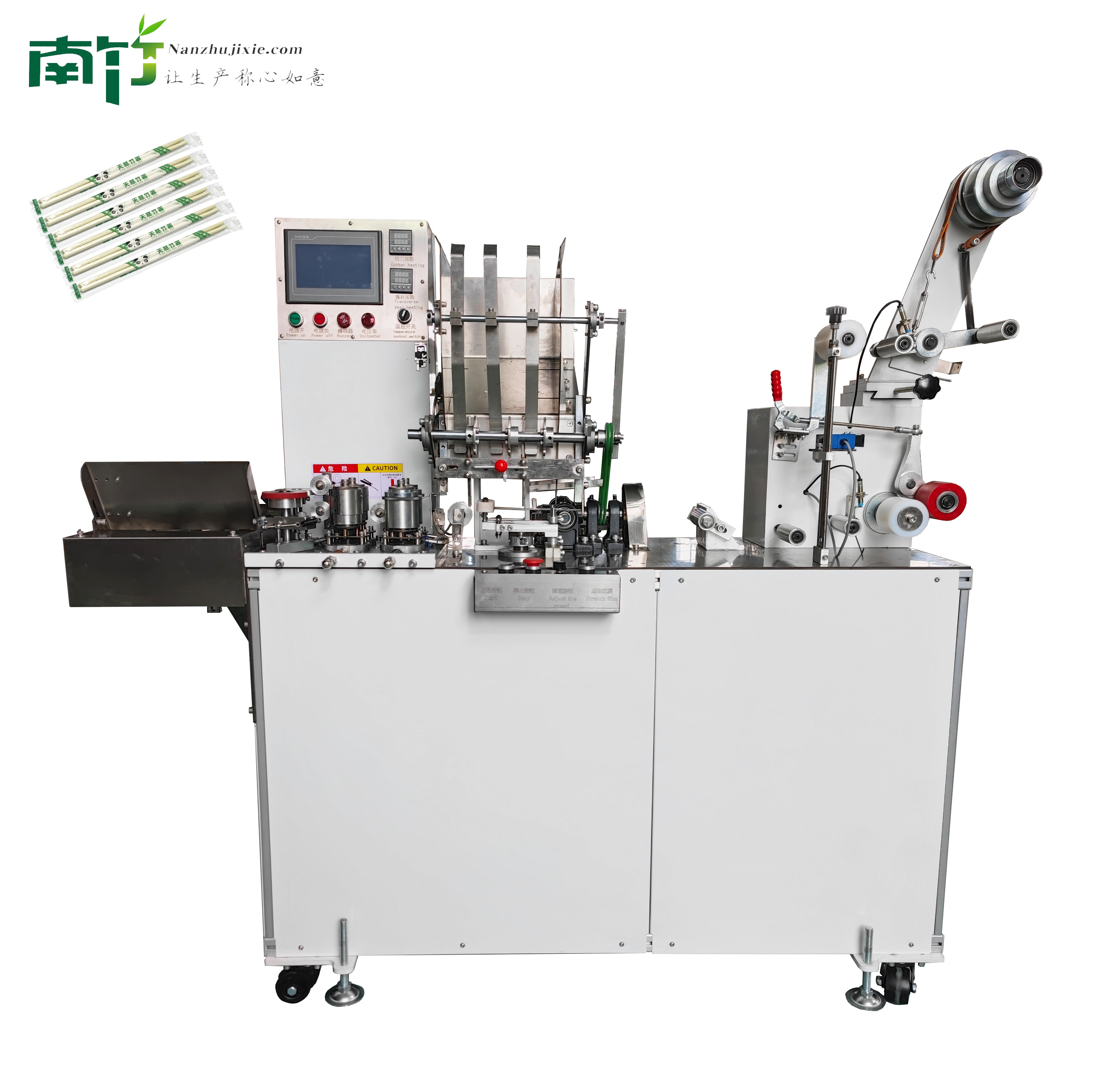NZSHYDWJ-GS300联线四合一筷子包装机是南竹机械出品的第一代四合一定位机,目前市场上被广泛应用。设备具有稳定性好、产能高、定位准确、能耗低和自动化程度高等优点。可用于18-24公分范围内的双生、圆棒、天削、圆禄等常见的一次性筷子包装。所采用的零部件均由南竹设备制造厂本厂自主研发加工。一流的数控生产设备为产品的高精度要求保证了长期的稳定性。设备所使用的程序也由南竹机械自主研发,在设备升级、优化及客户特殊要求的定制机上拥有绝对主动权!本设备还拥有以下功能: