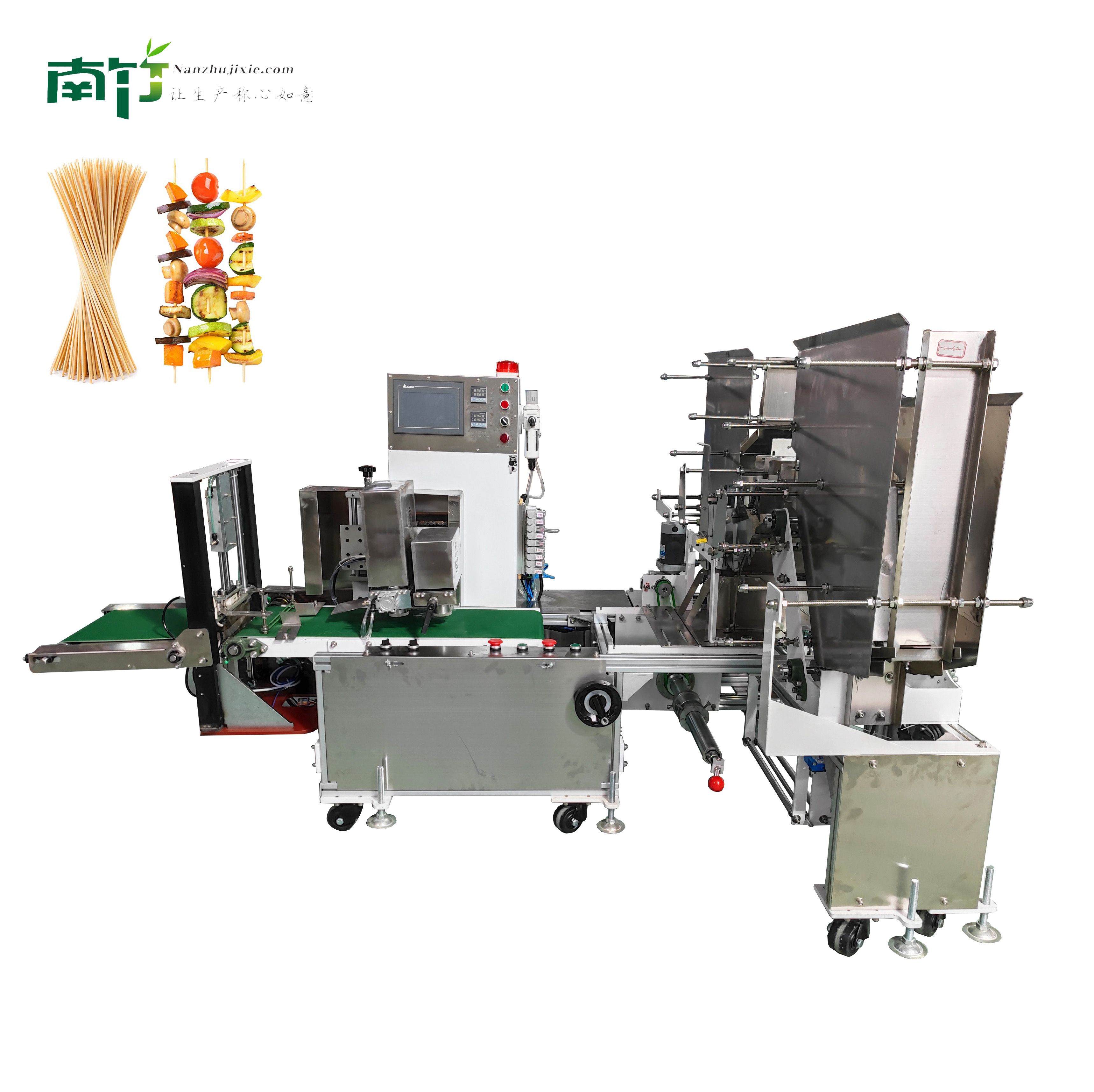 NZZQDSJ-300S双料斗竹签点数包装机是南竹机械出品的第二代双料斗竹签点数包装机,目前市场上被广泛应用。设备具有稳定性好、产能高、计数准确、能耗低和自动化程度高等优点。可用于15-30公分范围内的白签和碳化签等一次性竹签的包装。在设备上设置好数量之后,设备会自动计数,然后将要求数量的筷子包成一包。所采用的零部件均由南竹设备制造厂本厂自主研发加工。一流的数控生产设备为产品的高精度要求保证了长期的稳定性。设备所使用的程序也由南竹机械自主研发,在设备升级、优化及客户特殊要求的定制机上拥有绝对主动权!本设备还拥有色标跟踪定位(对已印刷好的opp膜和淋膜纸进行色标跟踪定位)和数控调节长短(调节15-30公分范围内的竹签不需要更换齿轮刀轮)等功能,大幅度降低了工人工作时的压力。其人性化的功能更是得到行业内用户的一致好评!在售后上南竹机械拥有强大的售后团队,更是秉承初衷-让生产称心如意!